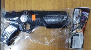 Česká obchodní inspekce zjistila na vnitřním trhu nebezpečný výrobek – hračku na baterie – pistoli se zvukovými a světelnými efekty s pouzdrem na 2 baterie AA 1,5 V. Materiál hračky plast/kov, délka 35 cm. Hračka je vložena do plastového průhledného obalu se štítkem s informacemi, symboly a označením CE, které nebylo uvedeno přímo na hračce, i když to charakter výrobku umožňuje.
