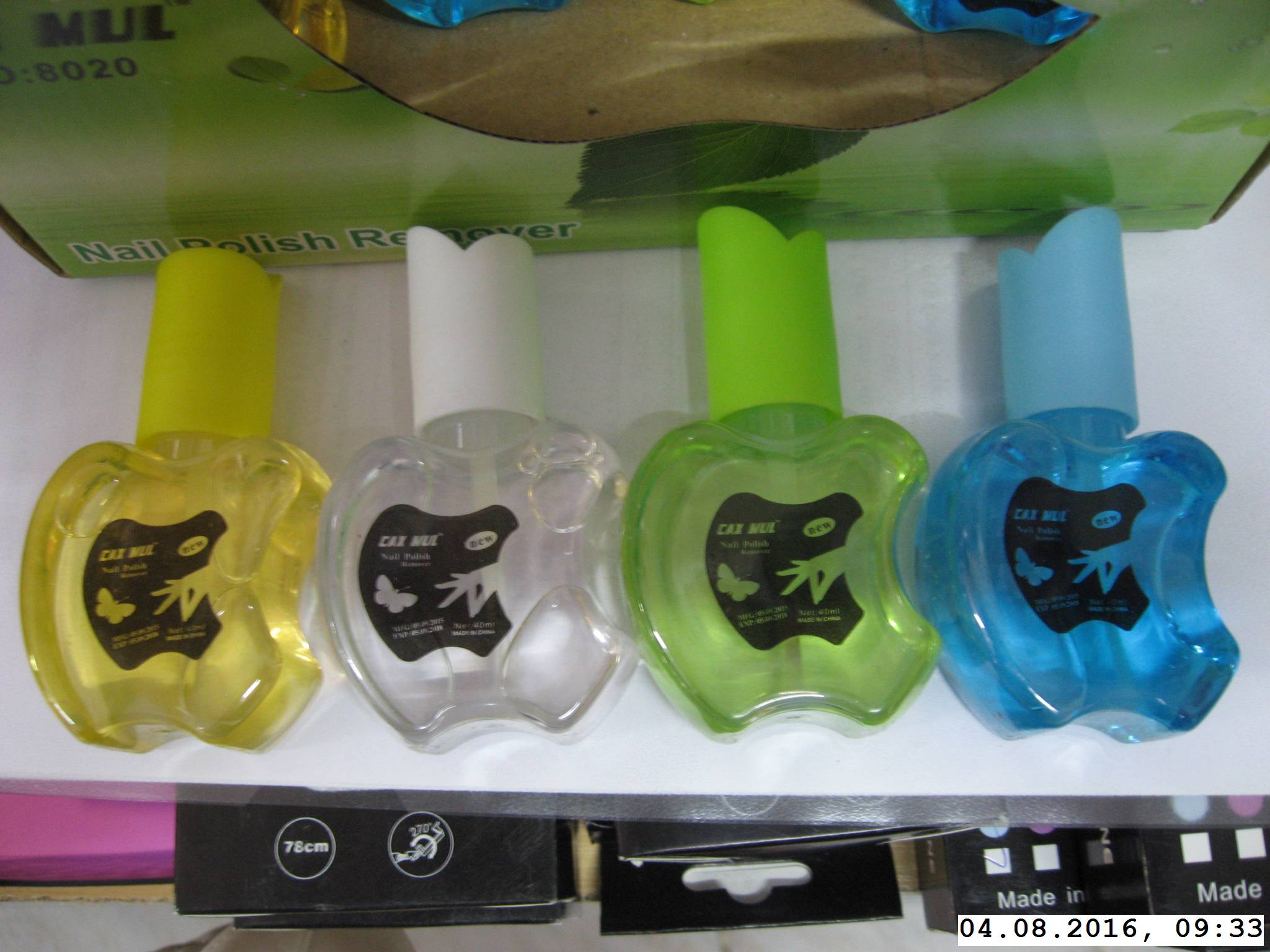 Popis výrobku: Jedná se o kosmetický přípravek – odlakovač – v průhledném plastovém flakónu tvaru jablka různých barev s různobarevnými plastovými šroubovacími uzávěry se štětečkem. Na obalu, do kterého je odlakovač naplněn, se nacházejí nápisy identifikující výrobek, jmenovitý obsah (40 ml), zemi původu, šarži a datum minimální trvanlivosti. Flakóny jsou umístěny v kartonové krabici, na které je uveden mj. anglický název výrobku a kód. Na kartonu je dolepena bílá papírová etiketa s českým názvem výrobku a dalšími texty charakterizující výrobek, kódy výrobku (včetně neexistujícího čárového – EAN – kódu), uvedením dovozce Beaty cosmetic s.r.o. (dle firmy došlo k zneužití jejího jména), země původu, piktogramu výrobku nevhodného pro děti do 3 let, symbolu Zeleného bodu a symbolu nabádajícího k šetrnému vztahu k životnímu prostředí (piktogram „basketbalisty“). Výrobek není vybaven povinným značením, jako je např.: osoba odpovědná za uvedení výrobku na trh (výrobce nebo dovozce) a seznam přísad.