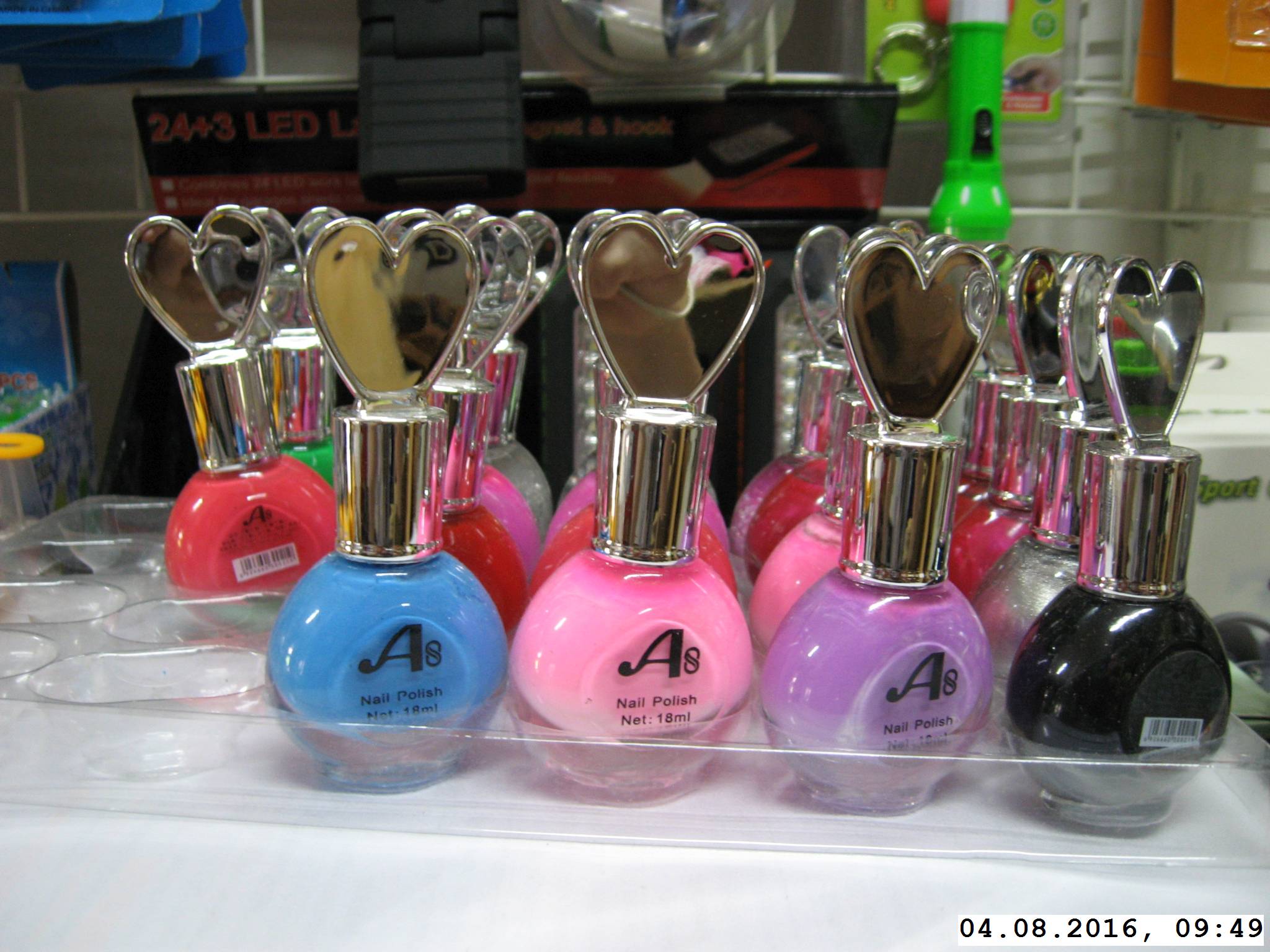 Popis výrobku: Jedná se o kosmetický přípravek – lak na nehty různých barev ve skleněném flakónu se stříbrným plastovým šroubovacím uzávěrem ve tvaru srdce. Na přední straně se nachází anglický název výrobku a je uveden jmenovitý obsah přípravku. Na zadní straně flakónu se nachází číslo výrobku, neexistující čárový (EAN) kód a seznam přísad za použití pravděpodobně čínských znaků. Výrobek není vybaven povinným značením, jako je např.: osoba odpovědná za uvedení výrobku na trh (výrobce nebo dovozce), datum minimální trvanlivosti, číslo šarže a povinné české texty.