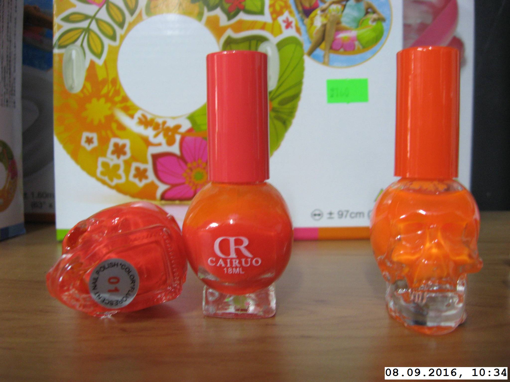 Popis výrobku: Jedná se o kosmetický přípravek – lak na nehty různých barev ve skleněném flakónu ve tvaru lebky s plastovým šroubovacím uzávěrem. Na přední straně se nachází nápis CR CAIRUO výrobku a je uveden jmenovitý obsah přípravku. Na dně flakónu je etiketa s číslem barevného odstínu a textem COLOR, FLUORESCENT NAIL POLISH. Výrobek není vybaven povinným značením, jako je např.: osoba odpovědná za uvedení výrobku na trh (výrobce nebo dovozce), datum minimální trvanlivosti, číslo šarže, seznam přísad a povinné české texty.