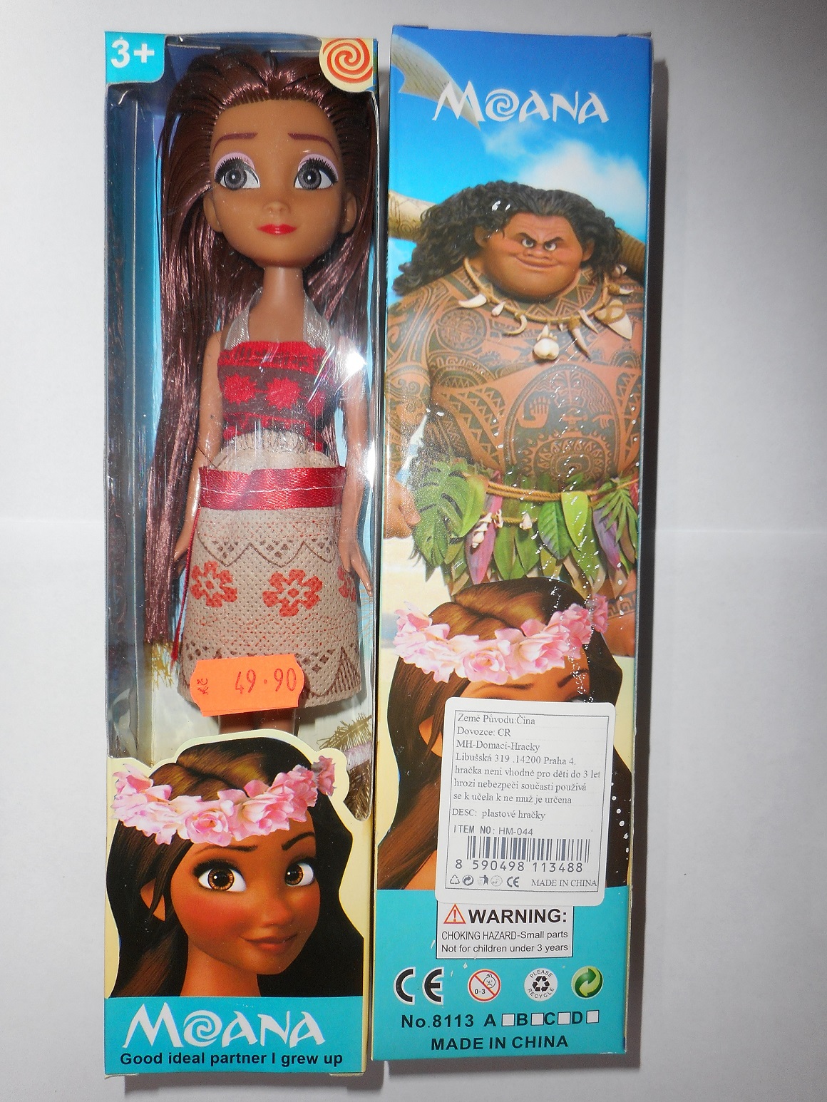 Popis výrobku: Plastová panenka vysoká cca 23 cm, s dlouhými vlasy, výraznýma očima a barevnými šaty. Panenka je balena v papírové skládačce s průhledem a s grafickým znázorněním hlavy panenky s květinovým věncem. Na skládačce je uveden text identifikující výrobek (MOANA) a anglický text (Good ideal partner I grew up) a symbol upozorňující na nevhodnost výrobku pro děti do 3 let (3+). Na zadní straně skládačky je graficky znázorněn maorský bojovník a hlava panenky s květinovým věncem a text identifikující výrobek (MOANA). Dále je zde uvedeno upozornění na nebezpečí udušení kvůli obsahu malých částí a s tím související nevhodnost výrobku pro děti do 3 let (vyjádřeno také piktogramem), symbol označení shody CE, symbol Zeleného bodu, recyklační symbol, země původu a kód No. 8113. Na zadní straně papírové skládačky je nalepena bílá etiketa s varovnými texty v českém jazyce s chybami (hračka není vhodně pro děti do 3 let hrozí nebezpečí součástí používá se k učela k ne muž je určena), země původu, neexistující firma jako dovozce, kód ITEM NO: HM – 044, neexistující EAN kód, označení shody CE, symbol Zeleného bodu, symbol nevhodnosti výrobku pro děti do 3 let a symbol nabádající k šetrnému vztahu k životnímu prostředí (piktogram „basketbalisty).