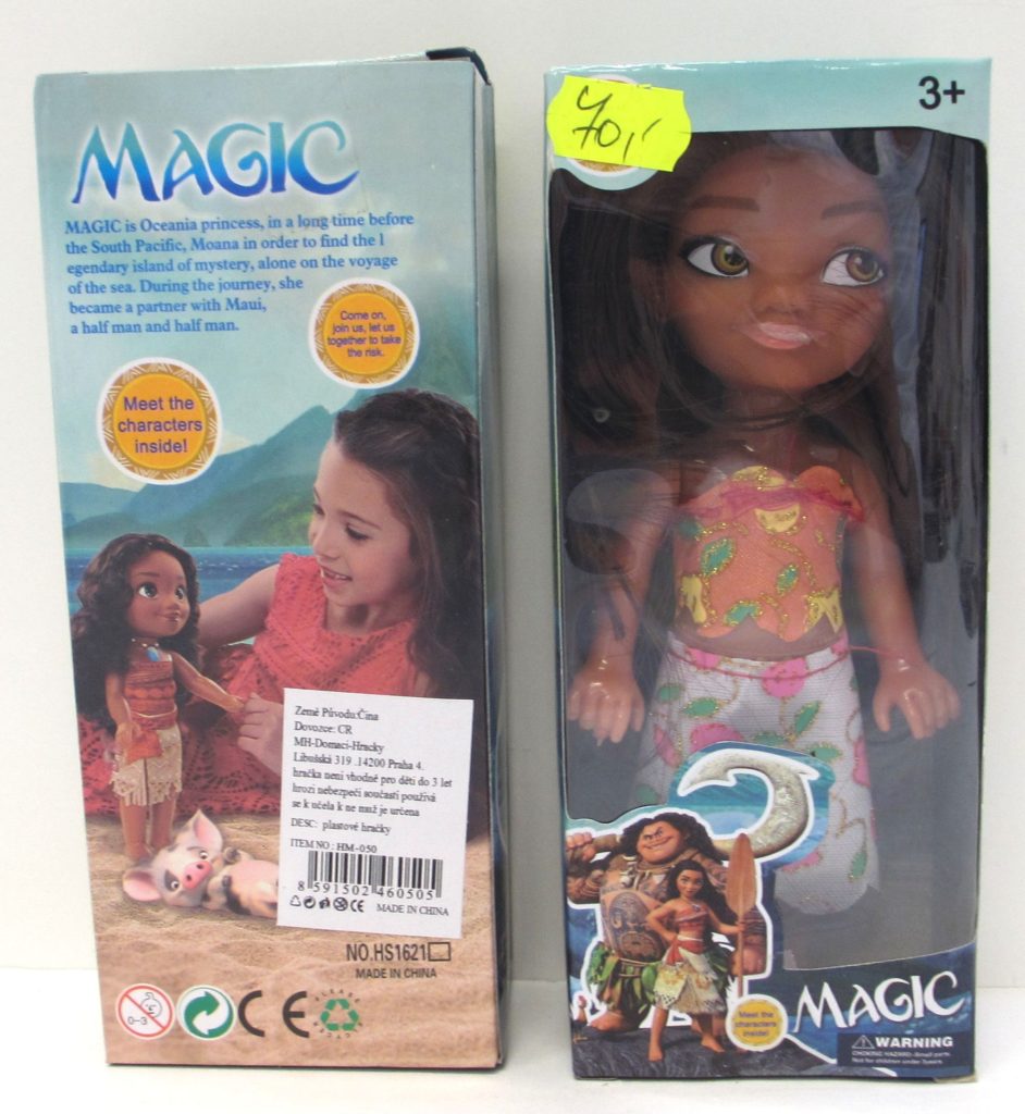 Popis výrobku: Plastová panenka tmavé pleti, vysoká cca 15 cm s dlouhými vlasy, výraznýma očima a barevnými šaty (např. top a sukně s květinovými motivy). Panenka je balena v papírové skládačce s průhledem a s grafickým znázorněním maorského muže, ženy a kohouta, je zde uveden text identifikující výrobek (MAGIC) a další anglický text (Meet the characters inside!), upozornění na nebezpečí udušení kvůli obsahu malých částí a s tím související nevhodnost výrobku pro děti do 3 let (3+). Na zadní straně skládačky je uveden text identifikující výrobek (MAGIC) a další anglické texty (MAGIC is Ocenia princess, in a long time before the South Pacific, Moana in order to find the legendary island of mystery, alone on the voyage of the sea. During the journey, she became a partner with Maui, a half man and half man. Meet the characters inside! Come on, join us, let us together to také the risk), fotografie dítěte s panenkou a graficky znázorněním prasátkem na pláži, symbol Zeleného bodu, označení shody CE, recyklační symbol a symbol nevhodnosti výrobku pro děti do 3 let, kód NO.HS 1621 a země původu. Na zadní straně papírové skládačky je nalepena bílá etiketa s varovnými texty v českém jazyce s chybami (hračka neni vhodně pro děti do 3 let hrozi nebezpečí součásti použivá se k učela k ne muž je určena), země původu, neexistující firma jako dovozce, kód ITEM NO: HM – 050, neexistující EAN kód, označení shody CE, symbol Zeleného bodu, symbol nevhodnosti výrobku pro děti do 3 let a symbol nabádající k šetrnému vztahu k životnímu prostředí (piktogram „basketbalisty). Na boční straně je uveden text identifikující výrobek a další texty (MAGIC, MAGIC ORDER TO FIND THE LEGENDARY ISLAND OF MYSTERY ALONE ON THE VOYAGE OF THE SEA DURING THE JOURNEY, Meet the characters inside!), upozornění na nebezpečí udušení kvůli obsahu malých částí a grafické znázornění maorského muže, ženy a kohouta. Identické anglické texty jsou uvedené i na druhé boční straně a na horní straně skládačky. Na druhé boční straně je fotografie dítěte s panenkou. Na spodní straně jsou uvedeny cizojazyčné varovné texty, upozornění na nevhodnost výrobku pro děti do 3 let a tvrzení, že výrobek byl vyroben dle mezinárodních norem.
