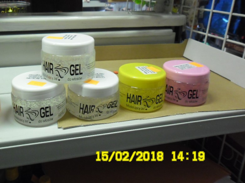 Popis: Kosmetický přípravek (gel na vlasy) je naplněn do různobarevných, průhledných plastových kelímků (bílý, žlutý, růžový) s uzávěrem o obsahu 150 ml. Na kelímku se nacházejí texty identifikující výrobek (HAIR GEL, Modelujacy zel do wlosów), nominální obsah, seznam přísad, kde je uveden mj. Methylchloroisothiazoline (and) Methylisothiazolinone, neexistující EAN kód, číslo šarže a cizojazyčné informující texty. Na různobarevných plastových uzávěrech je nalepena etiketa s textem (Metka: Gel na vlasy) a se sídlem distributora.