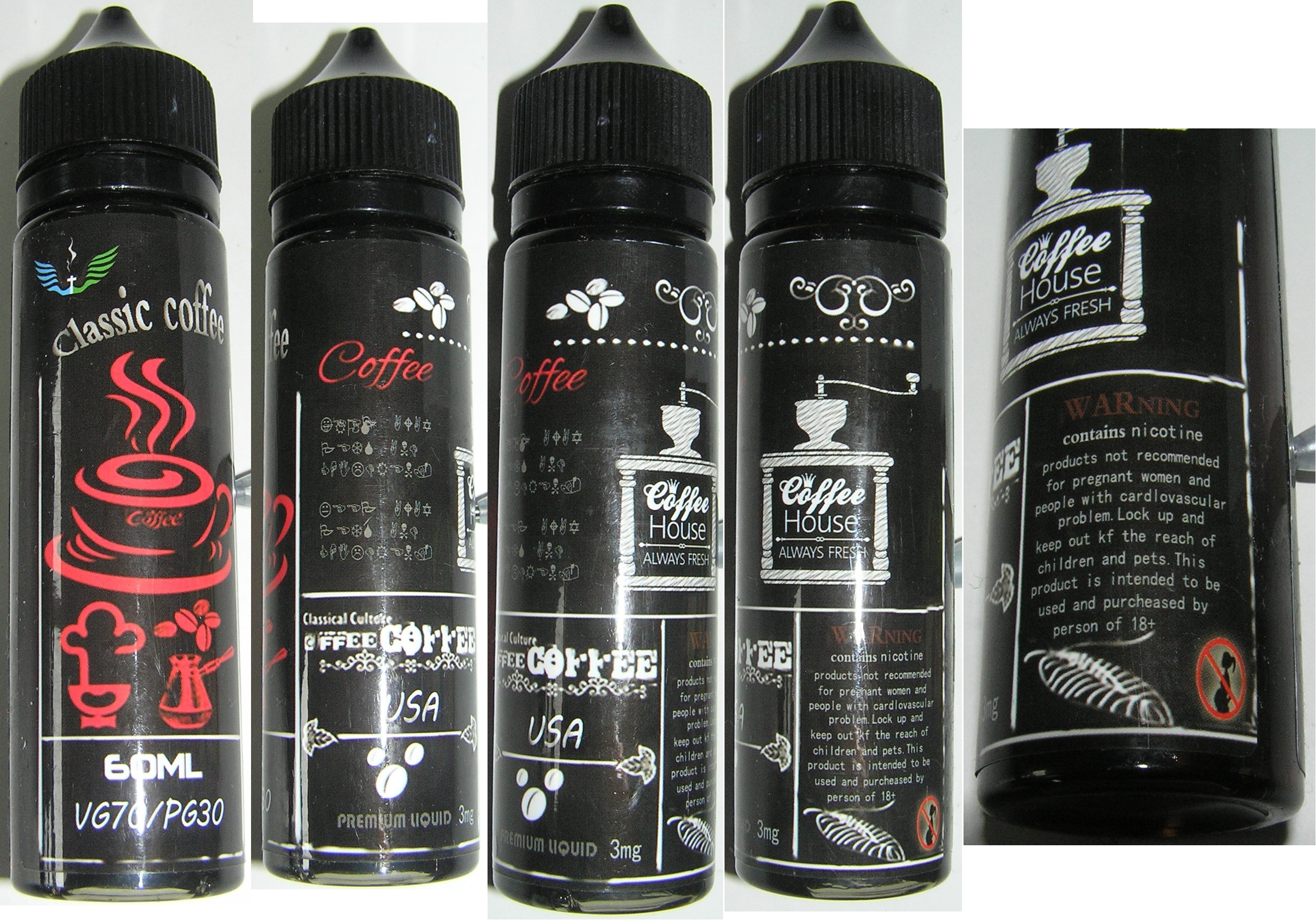 Popis: Náhradní náplň elektronické cigarety v černé plastové lahvičce s černým šroubovacím uzávěrem. Na lahvičce je nalepená černá papírová nálepka s malovaným motivem šálku horké kávy, kávových zrn, kafemlýnku a textem: „classic coffee, 60ML, VG70/PG30, Classical Culture, COFFEE COFFE, USA, PREMIUM LIQUID 3mg, Coffee House ALWAYS FRESH, WARNING contains nicotine, products not recommended for pregnant women and people with cardlovascular problém. Lock up and keep out kf the reach of children and pets. This product is intended to be used and purcheased by person of 18+“. Na etiketě jsou dále různé symboly, jejichž obsah není známý a symbol znázorňující nevhodnost výrobku pro těhotné.