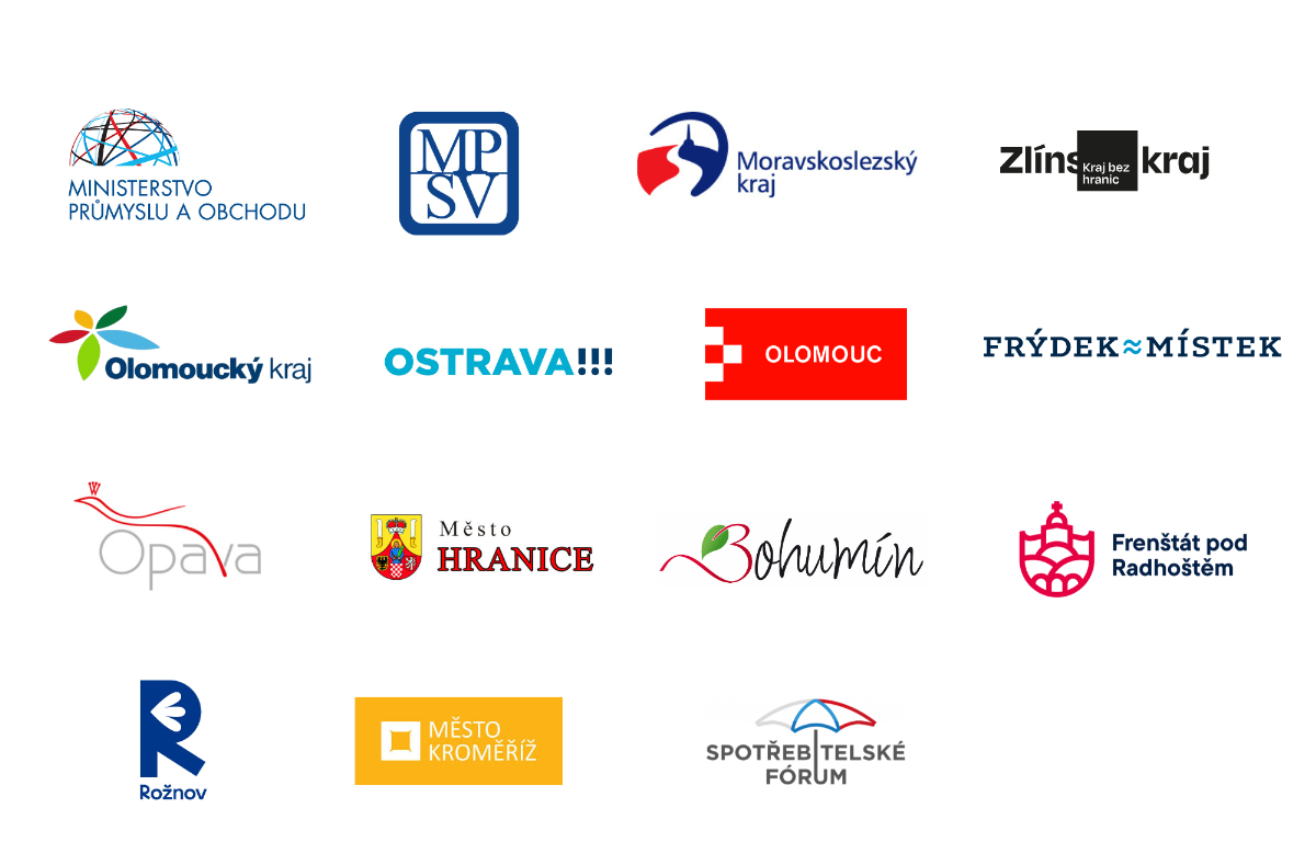 Bezplatné poradenské služby a vzdělávací aktivity jsou poskytovány zdarma díky finanční podpoře ze strany Ministerstva průmyslu a obchodu, Ministerstva práce a sociálních věcí, Moravskoslezského, Olomouckého a Zlínského kraje, měst Ostrava, Olomouc, Frýdek-Místek, Opava, Hranice na Moravě, Bohumín, Frenštát pod Radhoštěm, Rožnov pod Radhoštěm, Kroměříž a Spotřebitelského Fóra. Za podporu děkujeme.